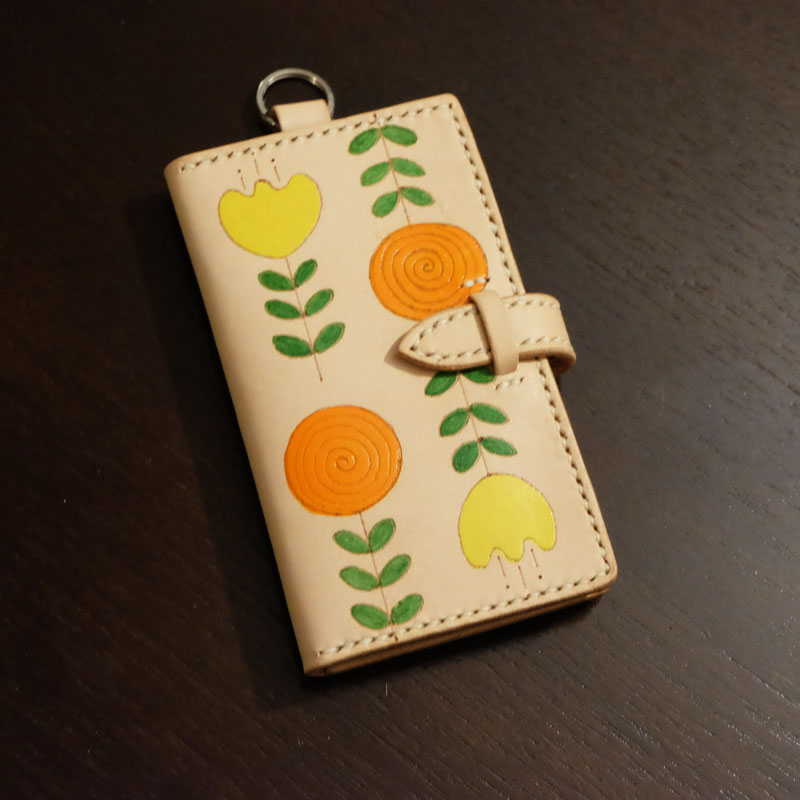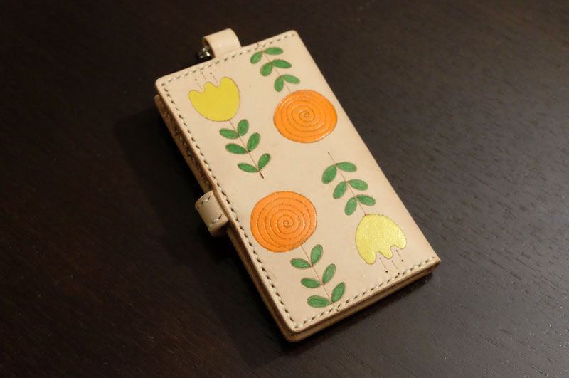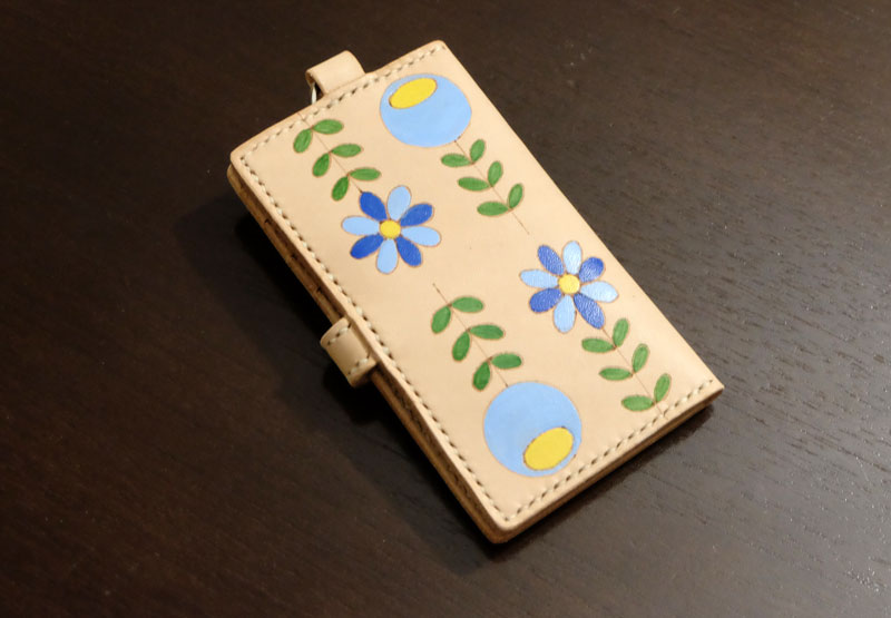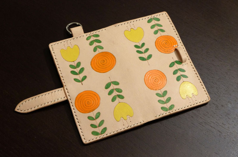 Hand sewn leather wallet. Painted flower motif. Stylish storage for all of your credit and transport cards.