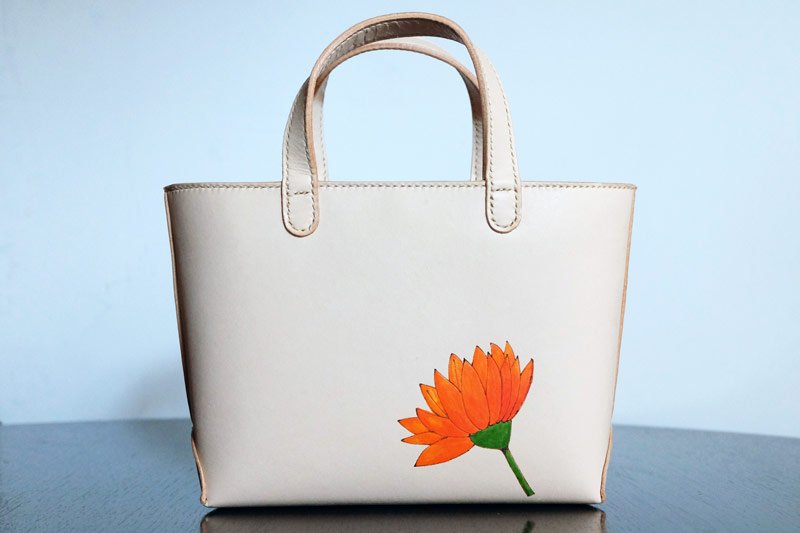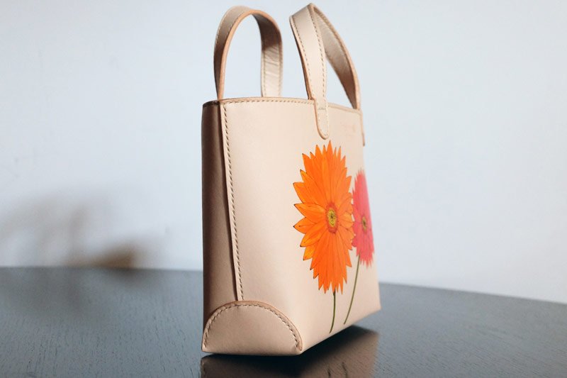 Hand stiched vegetable tan leather with painted gerbera design. Height: 18.5 cm. Width: 28 cm. Depth: 8 cm. Handle length: 25 cm.