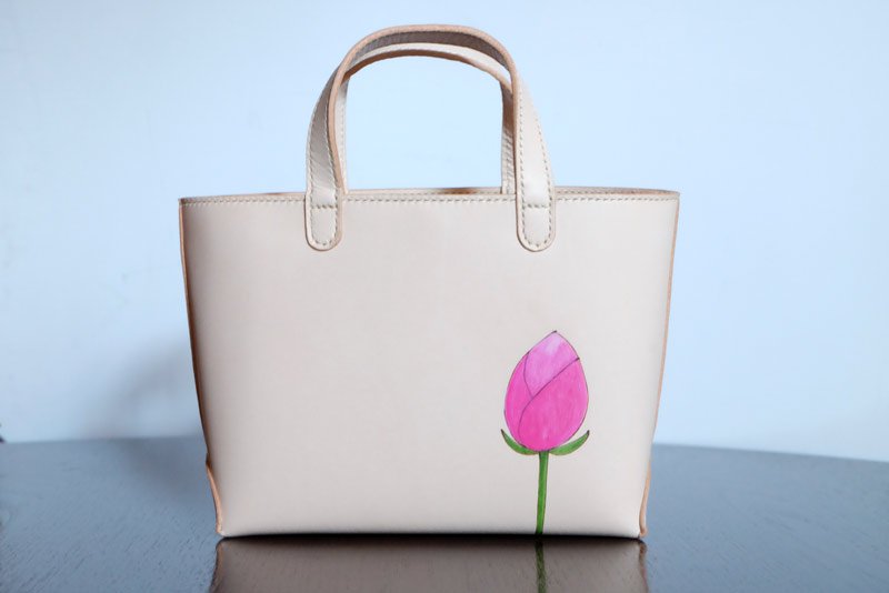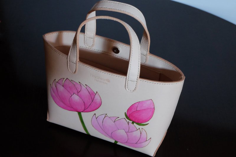 Hand stiched vegetable tan leather with painted lotus design. Height: 18.5 cm. Width: 28 cm. Depth: 8 cm. Handle length: 25 cm.