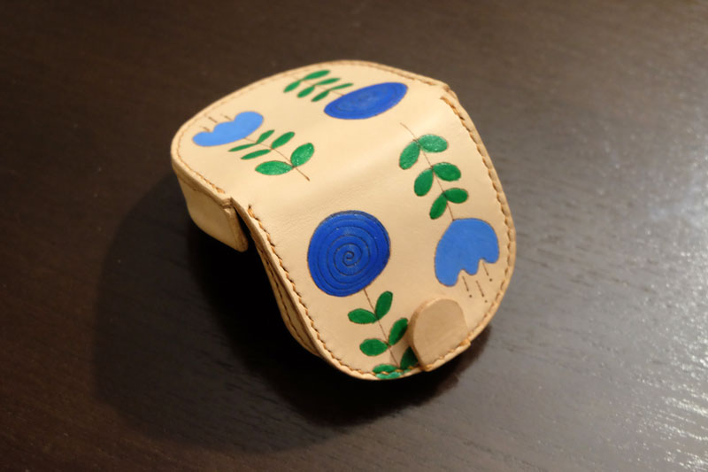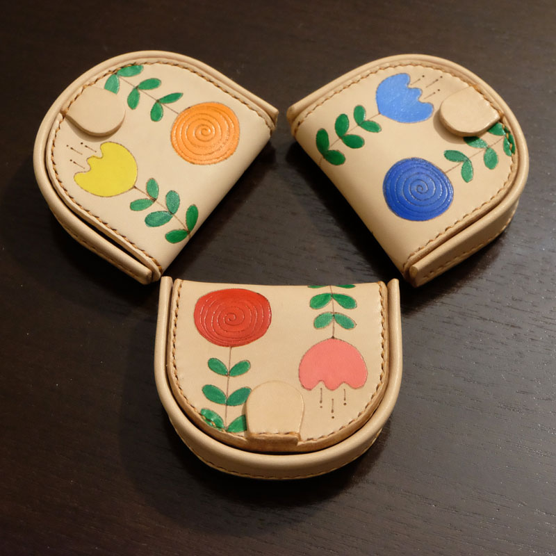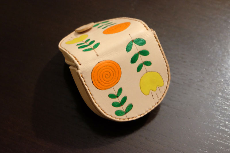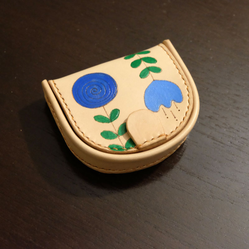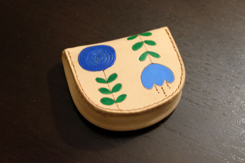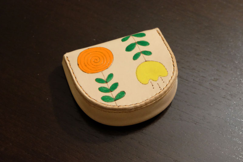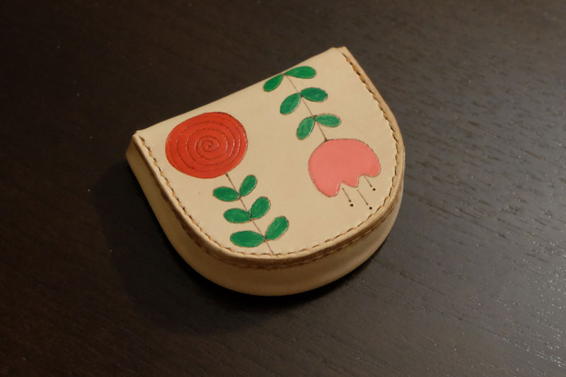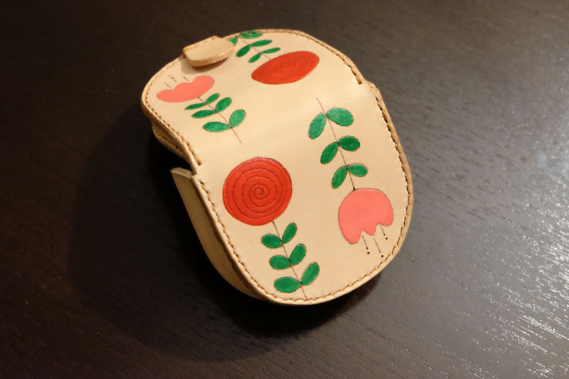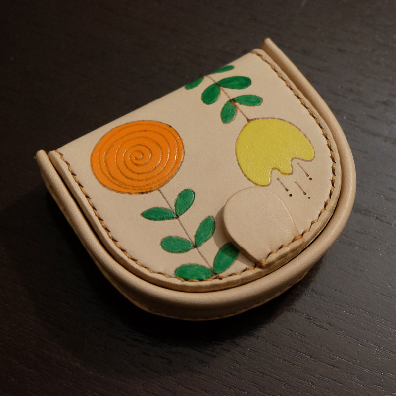 Hand stiched and hand painted flower motif, natural tan leather. Pyrography flower design coin case..