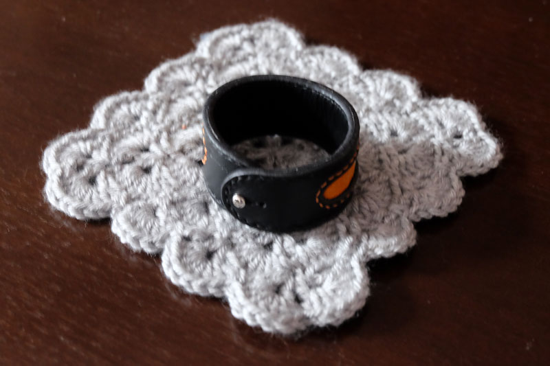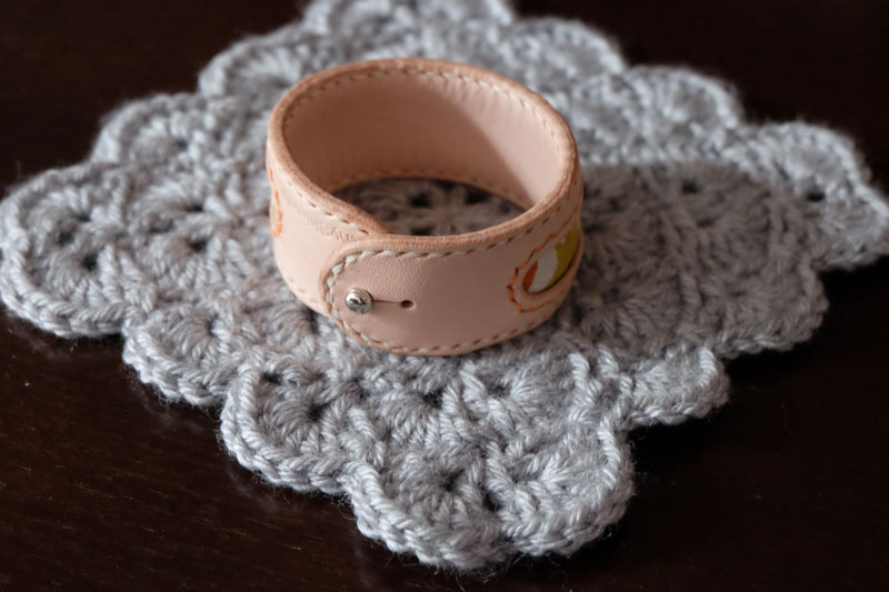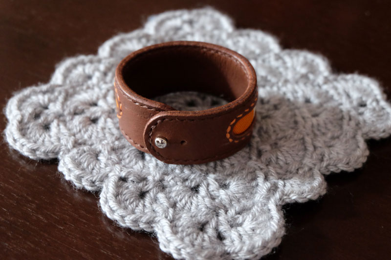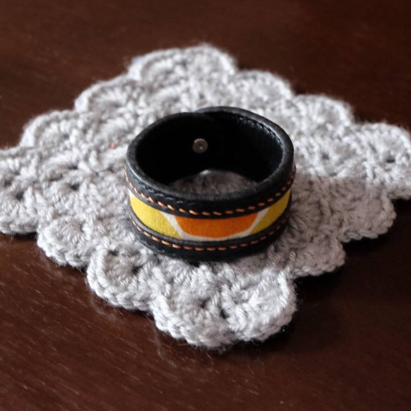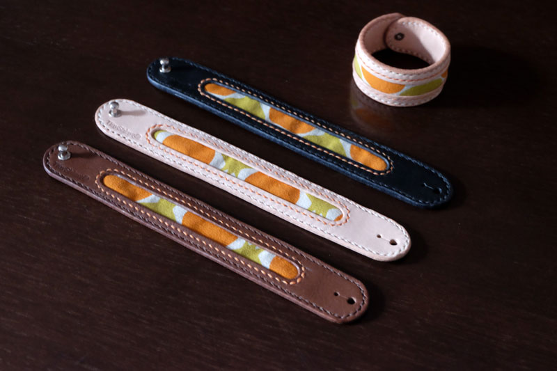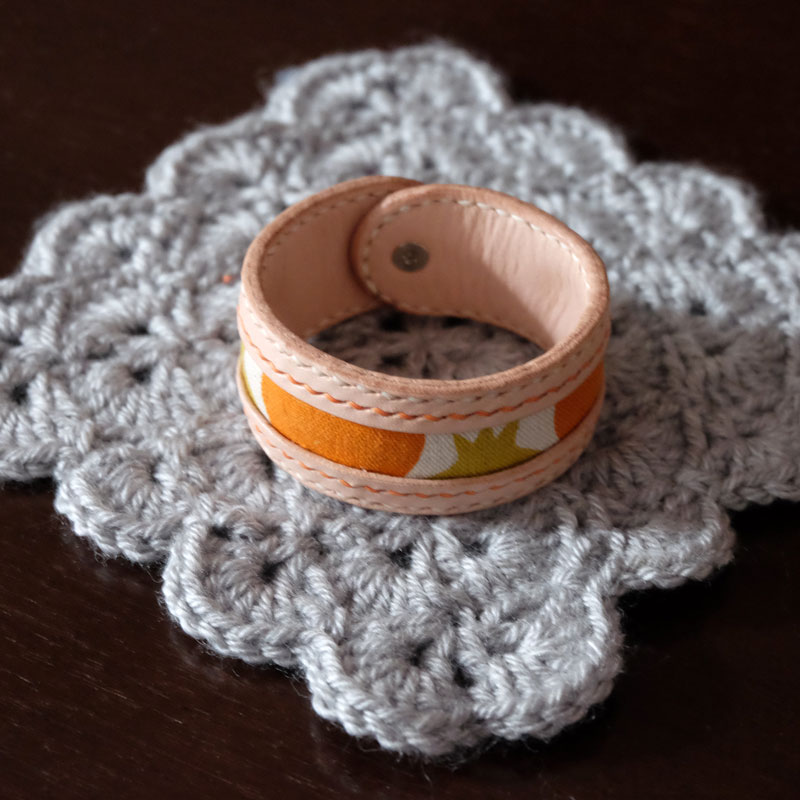 Hand-sewn leather bracelet with Japanese cotton and linen cloth. Size: 18.5 cm.